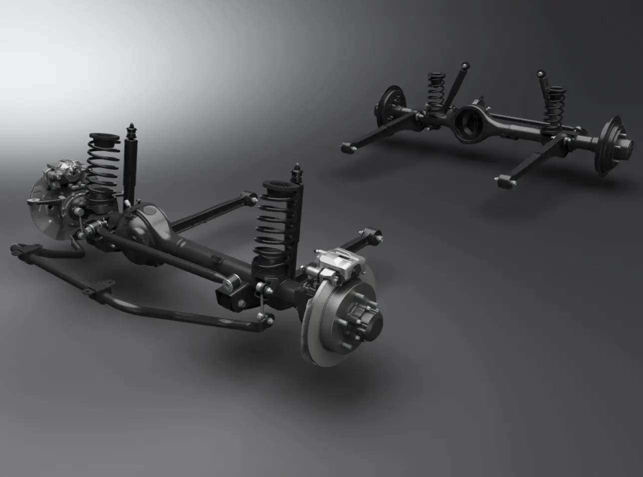 Cầu cứng 3 liên kết với lò xo cuộn, và thanh cân bằng ở phía trước