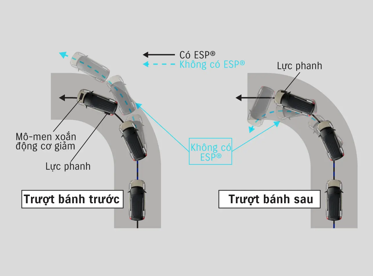Nếu xảy ra hiện tượng trượt bánh, hệ thống sẽ tự động điều chỉnh công suất động cơ và phanh để kiểm soát hiện tượng trượt bánh, đảm bảo xe luôn vận hành theo quỹ đạo mong muốn.